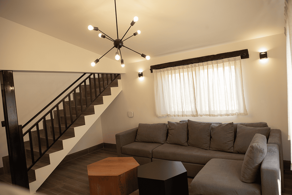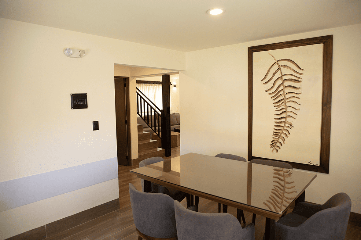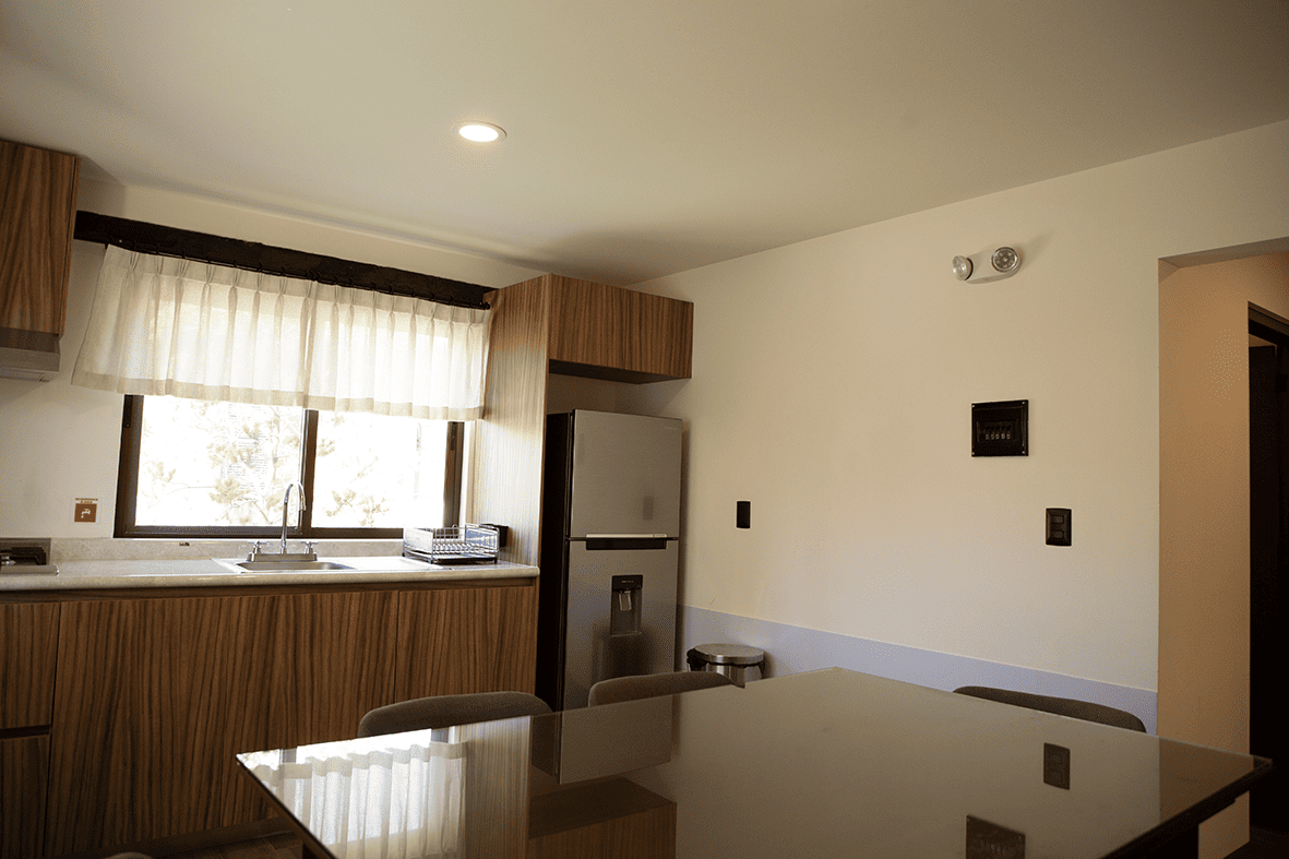 • Cocina con equipamiento básico (refrigerador, estufa, cafetera, batería y utensilios de cocina, cubiertos y vajilla)