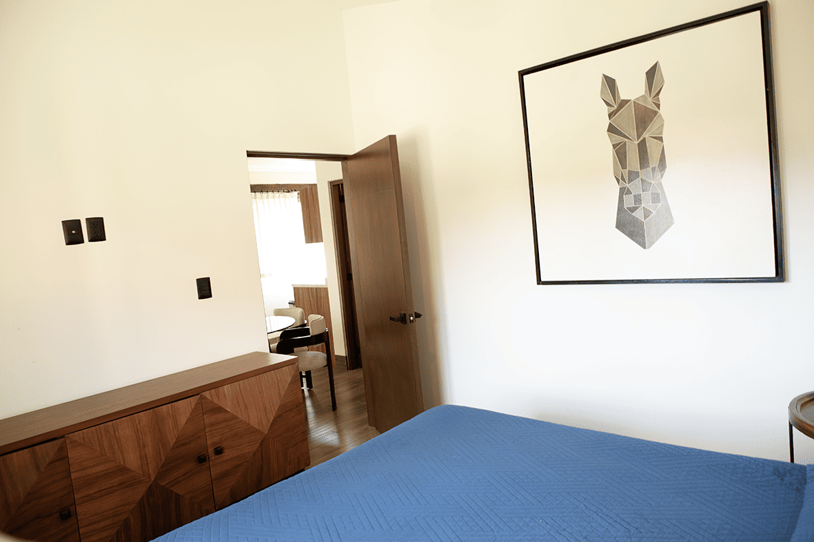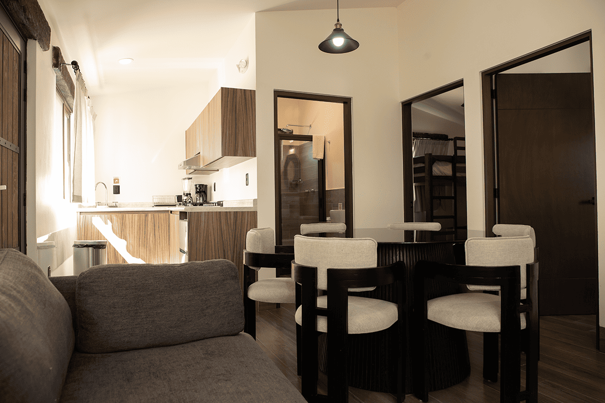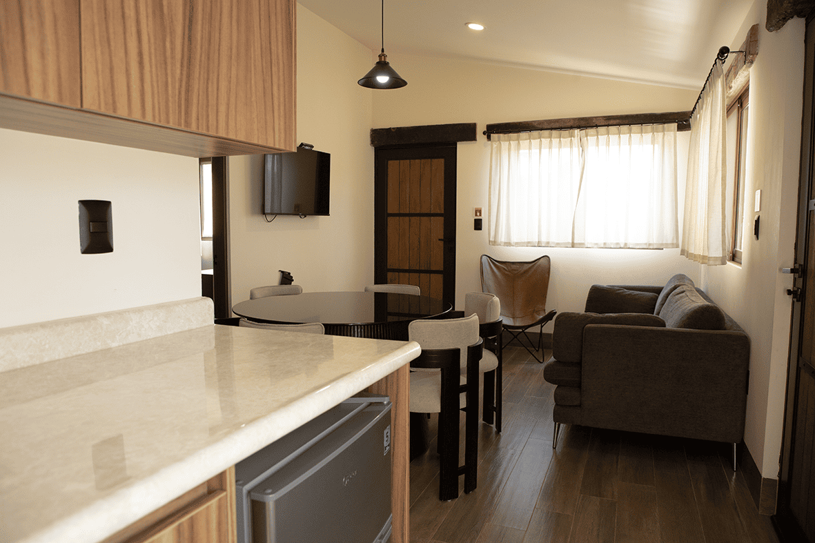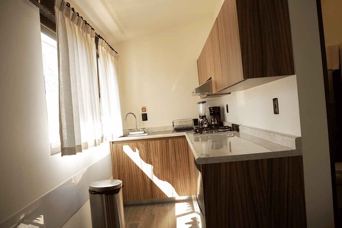 - Cocina con equipamiento básico (refrigerador, estufa, cafetera, batería y utensilios de cocina, cubiertos y vajilla)