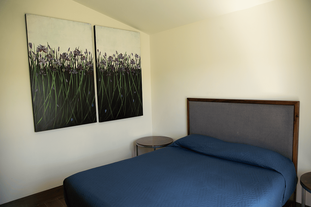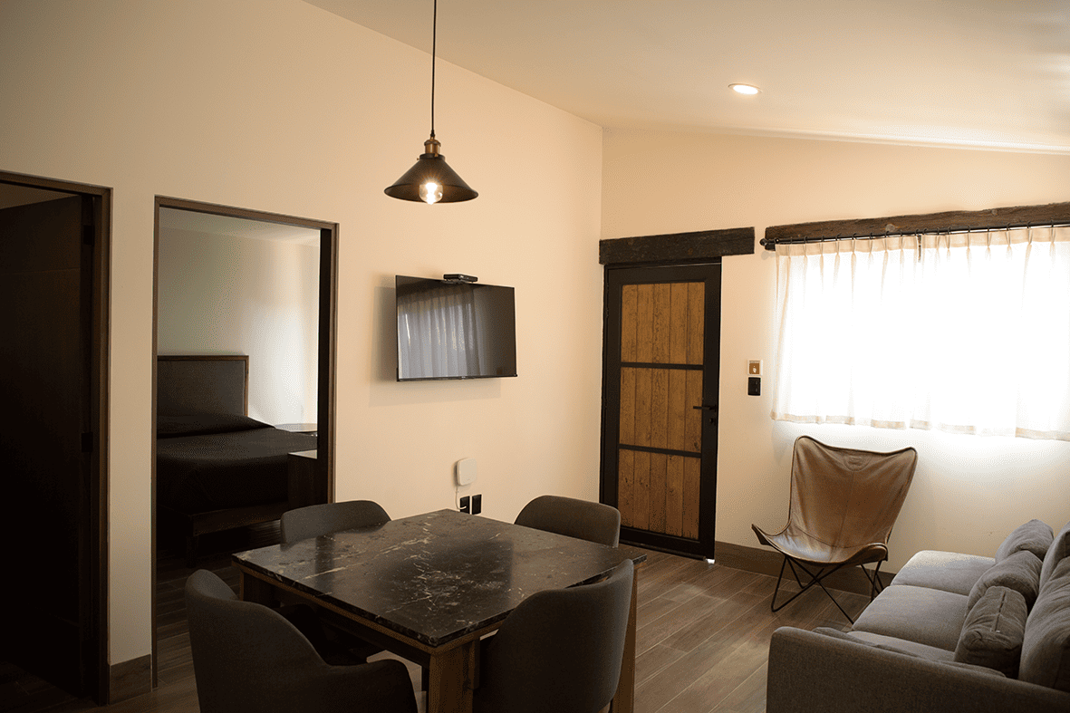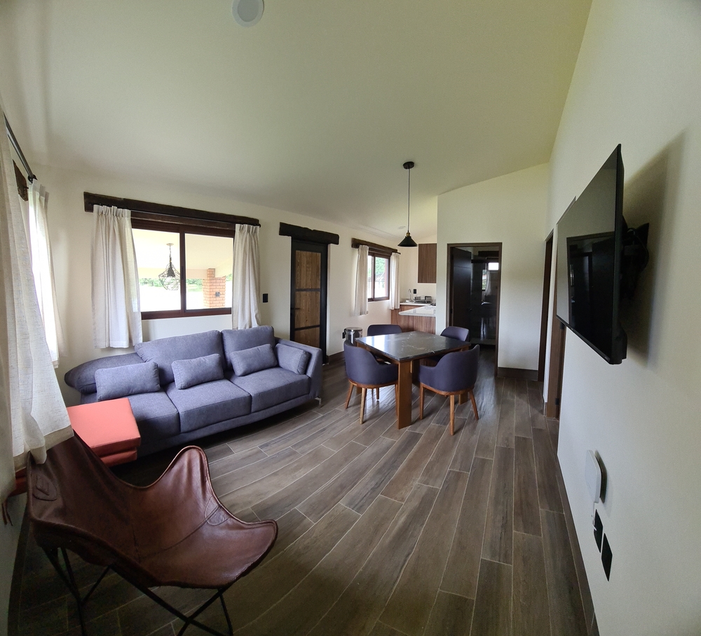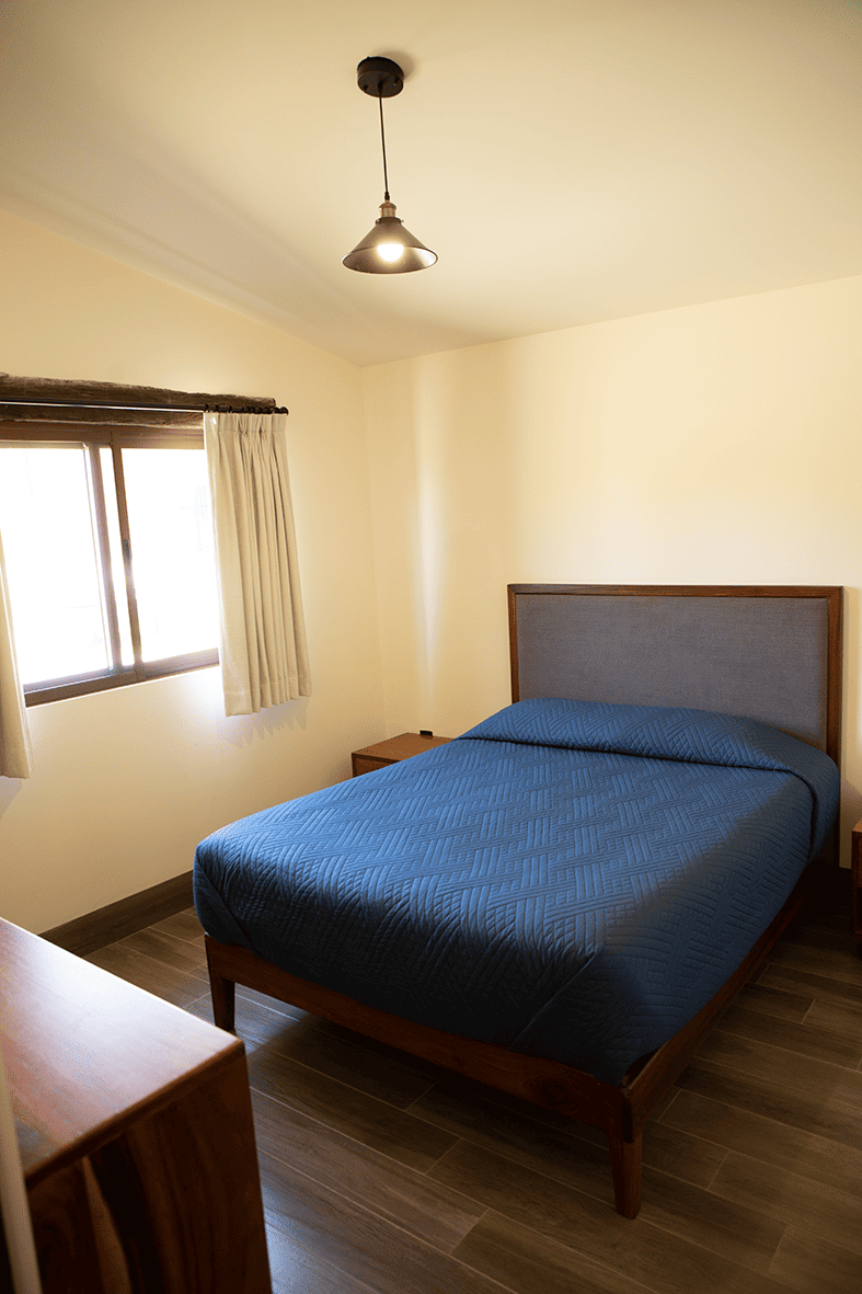 Cabaña de una persona con sala, comedor, cocina, TV, 2 recámaras con cama Queen Size cada una, terraza frente al lago, WIFI y baño completo.